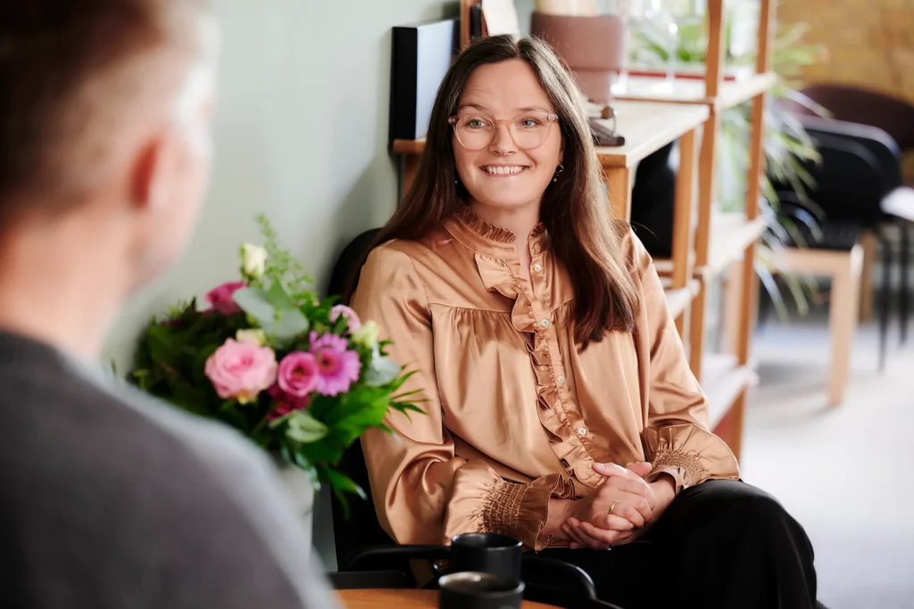 Helle er god til at lytte, men hun får også sagt på en god måde, når vi bevæger os for meget væk fra det som jeg kom for at få hjælp til.
